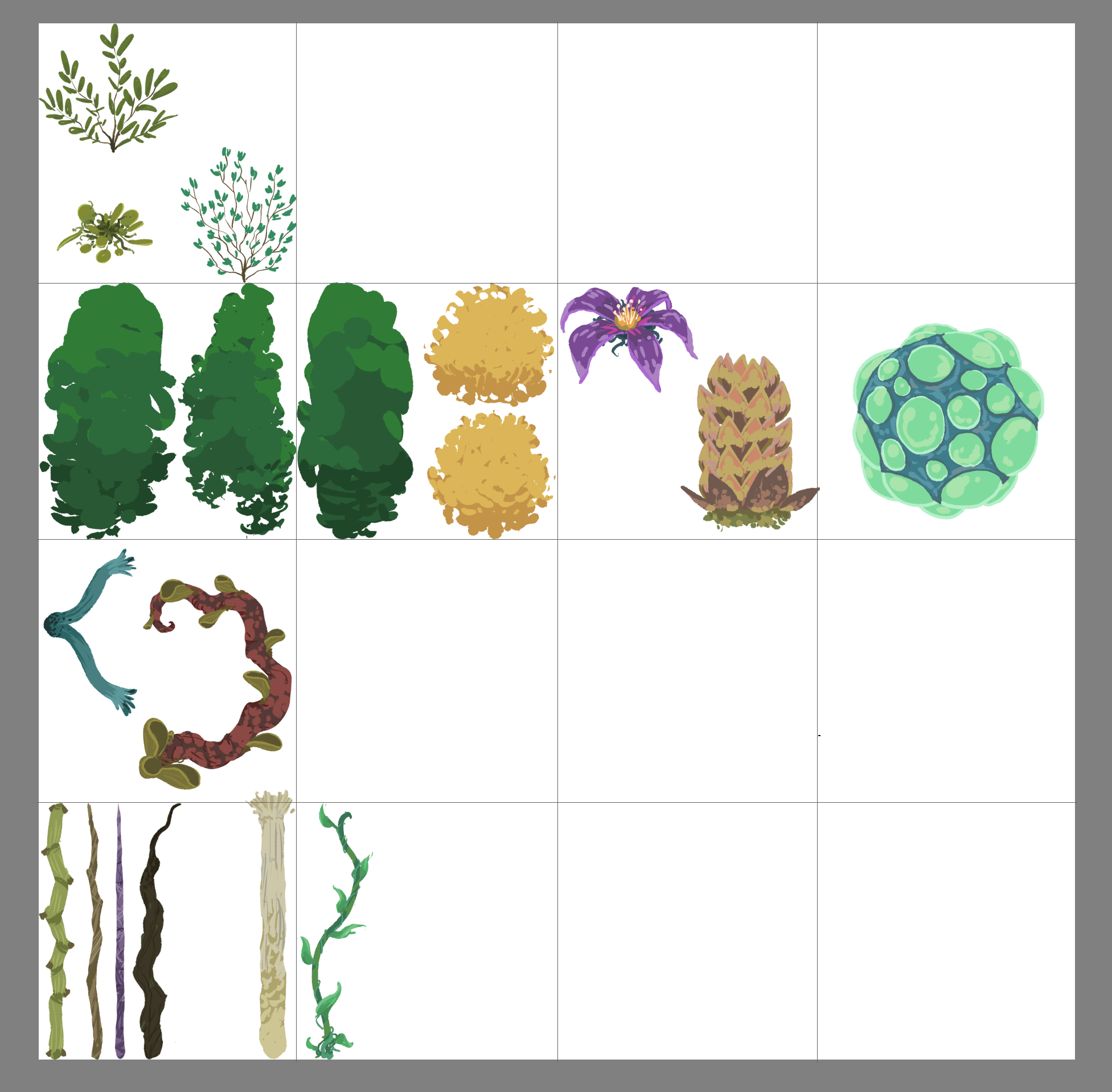 Everything for this game needed to be simpler, because the system was going to be a lot more complicated than with our previous attempt. I am not particularly happy with how things look, but soon after we began I realized that making varied plant modules that players would stitch together would look weird and alien. So I tried to go with the flow and make things weird and alien (kept looking at Scavengers Reigns)